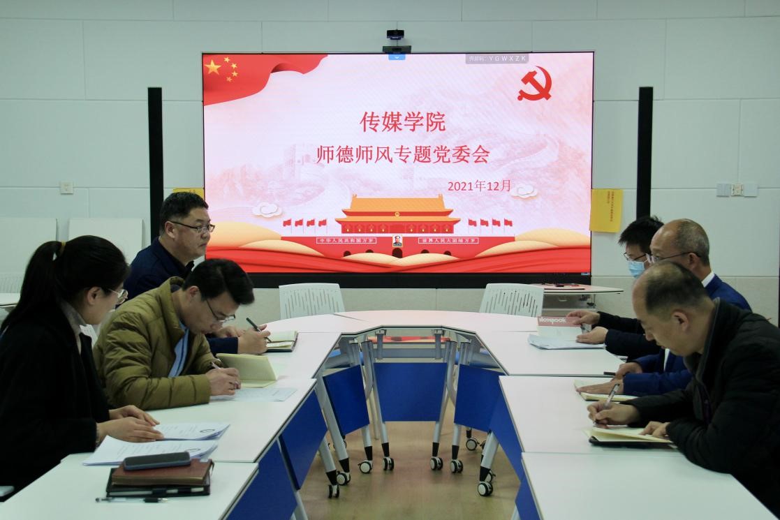 于JC813召开师德师风专题党委会。学院党委书记王宏杰、院长王焕景、副书记田荣林、副院长赵可云、教职工党支部书记徐振国、辅导员商秀英参加会议并进行深入学习。