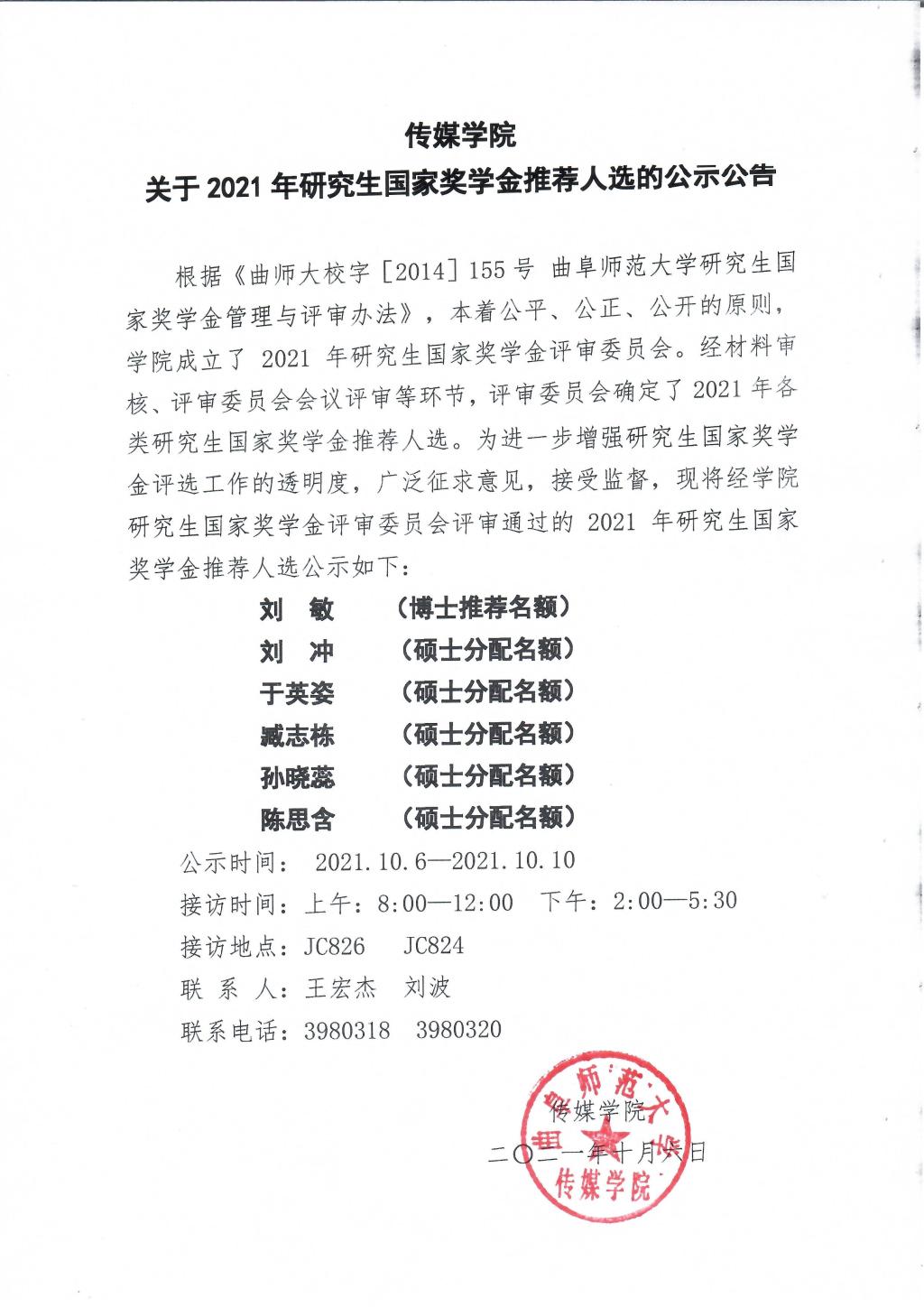 【来源:麻豆视频av 关于2021年研究生国家奖学金推荐人选的公示公告 | 发布日期:2021-10-06 】