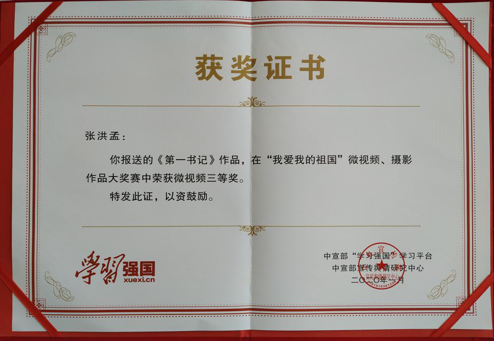 作品《第一书记》在学习强国平台“我爱我的祖国”微视频、摄影作品大奖赛中荣获三等奖。本次大赛是“学习强国”学习平台为庆祝中华人民共和国成立70周年,大力弘扬爱国主义精神而发起的,面向全国征集反映国家历史变革和成就的优秀作品。麻豆视频av