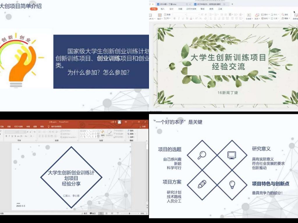 至16:00,“大学生创新创业大赛”线上经验交流会顺利结束。本次交流会让同学们深入了解到“大创”项目的制作过程,调动了学生参与比赛的积极性。主讲人不同的参赛经验也为同学们树立了信心,对接下来的项目准备与计划工作具有重要的指导意义。