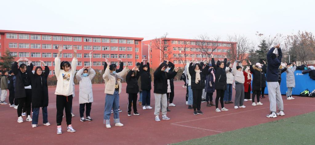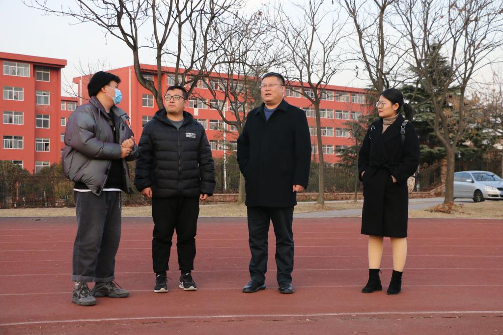 党委副书记徐正伟、2020级辅导员刘扬帆、商秀英前往学校西操场,查看现场情况并检验冬训训练成果。