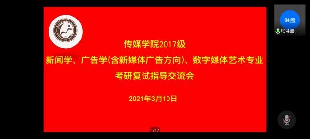 组织召开2017级新闻学、广告学、数字媒体艺术专业考研线上复试指导交流会。会议由学院新闻传播系主任刘波,学院教师赵鑫、李秋华担任主讲人,2017级辅导员张洪孟主持。2017级新闻学、广告学、数字媒体艺术学专业全体学生参与。