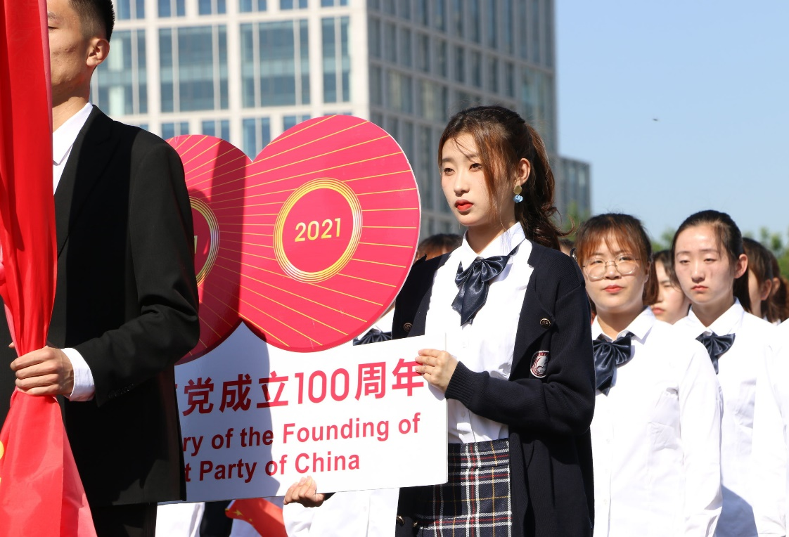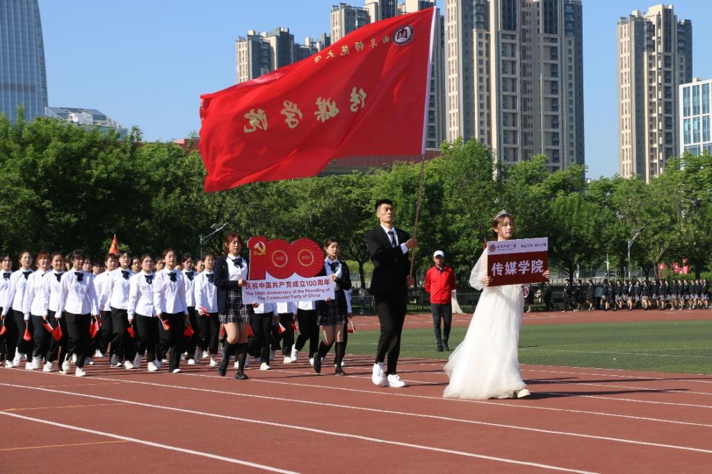 方队高喊着“青春无畏,筑梦传媒”的口号,踏着矫健的步伐,精神抖擞。昂扬口号,亮出热血澎湃的自信态度;昂首阔步,尽展意气风发的少年豪情。学院方队中的每个人都身穿白色院服,手持五星红旗,纯洁端庄的白色与热烈激昂的红色交相映衬,展现出传媒学子清爽阳光的青春气息与活力洋溢的奋斗精神。方队队员还举起了“庆祝中国共产党成立100周年”的创意设计宣传牌,宣传牌上的 “100”字样中央写有两组数字——“1921”和“2021”,左上方印有金黄党徽图案,寓意传媒学子始终铭记宣传使命,并以昂扬向上的青春风姿,传承党史精神,献礼百年华诞。在各学院方队展示完毕后,伴随着轻松动感的音乐,麻豆视频av