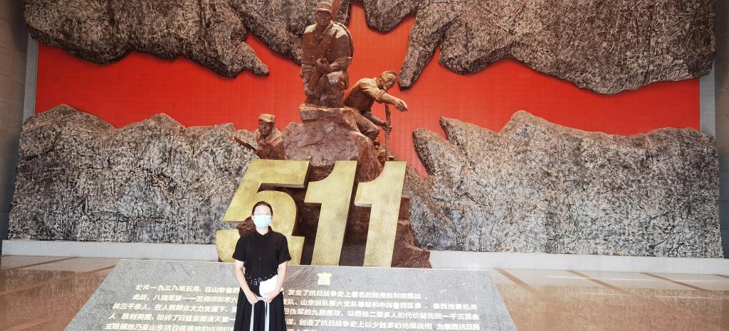 队员查阅肥城市陆房红色研究基地相关资料得知陆房突围胜利纪念馆座落于山东省肥城市安临站镇东陆房村凤凰山脚下,于2015年9月18日落成,建筑面积5300余平方米,馆名由中央军委原副主席迟浩田上将题写。纪念馆分上下两层,综合运用声光电科技与多元化视听手段,以新颖独特的艺术形式,生动再现了陆房战斗中八路军将土绝地反击、奋勇歼敌的壮烈场面,人民群众舍生忘死、助力突围的血肉之情。馆外无名烈士纪念广场,通过建成英烈墙的形式,将陆房战斗中牺牲的178名无名烈士高规格进行安葬。馆内分设六大展区,队员依次参观了各个展区,并在场馆允许的地方拍照留念。