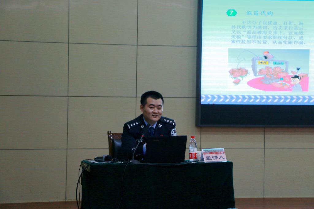 讲座伊始,王顺涛从职责、工作范围等多个方面介绍了网警,加深了同学们对网警的认识和了解。紧接着,他从四个方面说明了大学生网络信息安全常见的问题及解决方案。关于当前我国的网络安全形势,王顺涛通过图像展示了当前网络安全威胁的分布范围及个人信息泄露的大概统计,并具体介绍了当前存在的网络安全威胁。除此之外,王顺涛还详细介绍了中国七大电信诈骗基地,并全面的讲解了常见的22种网络诈骗形式,以此来提高大学生网络安全的防范能力。随后,王顺涛向同学们解释了网络谣言的含义、性质和特点,指出网络谣言具有攻击性和极大的社会危害性。他通过介绍具体的事例使同学们充分认识到网络谣言的危害,并提出了具体防范措施。最后,王顺涛就大学生如何做到安全文明上网提出建议,从安全使用智能手机、微信相关隐私功能、wifi安全、常见病毒及其防范等方面进行了详细地讲解。