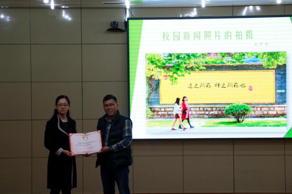 马克思主义青年培训工程导师,并由刘蓉老师颁发聘书。接下来,王中华老师从“照片欣赏”、“摄影构图”、“新闻摄影”三个方面进行讲解,并通过展示自己的摄影作品为同学们分享了有关新闻宣传、摄影技巧的心得,强调了学会拍摄新闻照片对学生干部工作的重要性。培训会的第二环节由校学生会青工部部长李洁为大家讲解。她主要为同学们讲述了“第二课堂”的相关制度和内容,并强调“第二课堂成绩单”是提高学生综合素质的新方式。随后,李洁向大家介绍了“到梦空间”应用的各种功能体系,对提高学生干部对该应用的运行与管理能力具有较大意义。
