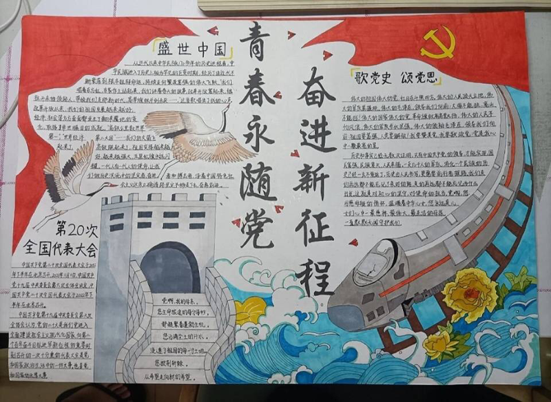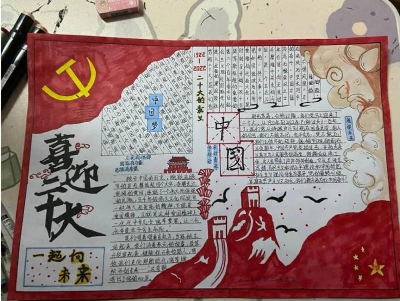 本次活动以线上的形式举行,参赛同学在手抄报中融入了高铁、长城、党旗党徽等等元素,加之对党的详细介绍以及对召开二十大的认识等,在创作中加深了对于党召开二十大的理解。