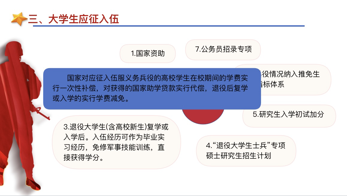 国防安全教育是我国提高全民国防意识和加强国防后备力量建设的重要环节。班会上,乔希详细介绍我国国防安全形势和国防教育的重要性,希望新生们主动了解国防知识,积极参与学院举办的各类国防教育活动,在实践中践行“请党放心,强国有我”的强国誓言。她结合学院实际案例宣讲征兵流程、征兵政策、入伍要求、大学生优惠政策等相关内容,展示入伍同学的军旅风采,以此鼓励新生踊跃参军,到绿色军营里接受锻炼,磨砺坚强意志,体验精彩人生,报效伟大祖国。