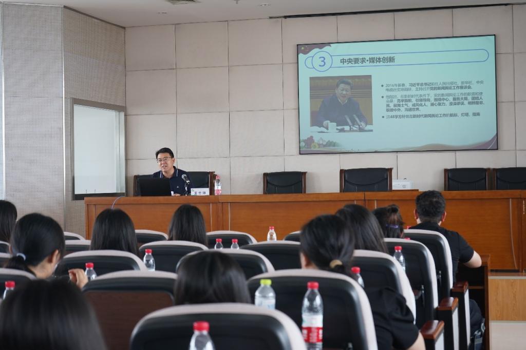 同学们在指导老师与讲解员的引导下,分别参观了寿光市融媒体中心与利津县融媒体中心。在实地走访中,同学们将理论知识与行业前沿相结合,了解县级融媒体中心改革的具体措施与最新成果,切身感受新技术给新闻传播行业带来的冲击与机遇,通过发展实例思考社会发展对于媒体行业的最新要求与新时代新闻人应有的责任担当。寿光市融媒体中心王玉坤为同学们带来关于“让好的故事更有力量——新闻的坚守与创新突破”的报告,以一个一线新闻工作者的视角,分享新时代下新闻业的价值与发展方向,并与同学们互动交流县级融媒体建设经验。