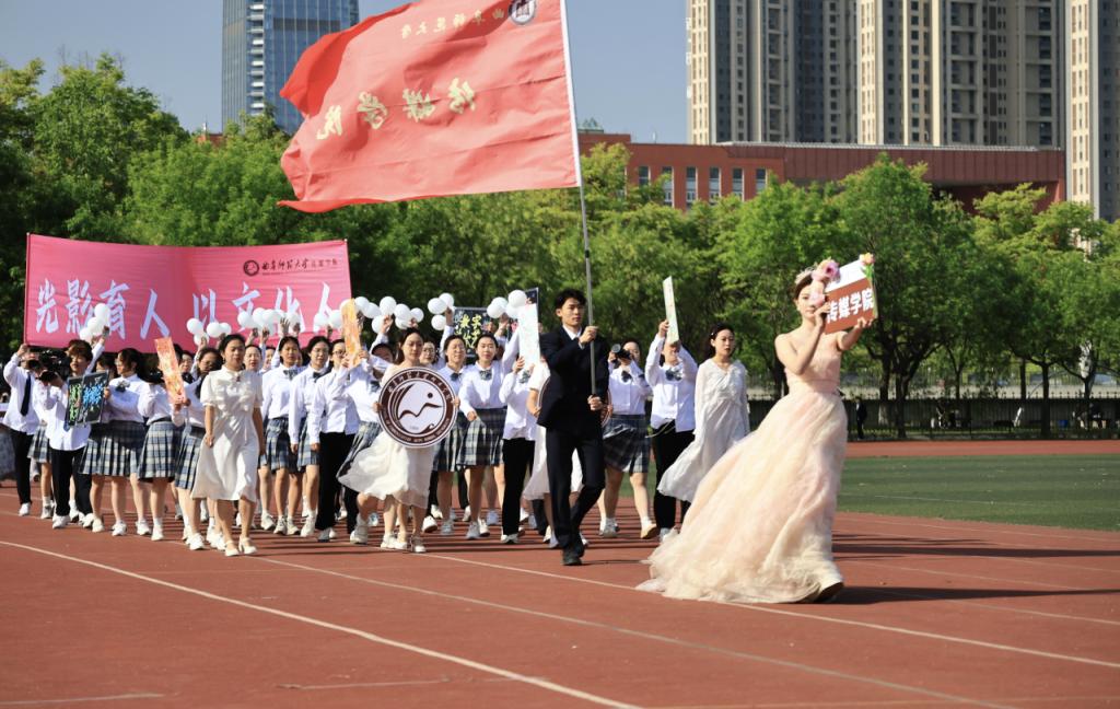 开幕式在《运动员进行曲》的激昂旋律中拉开序幕,各个代表队依次向主席台展现学院特色风采。传媒方阵代表团成员身穿白色院服,齐步迈入场地。他们肩扛专业录像摄像装备,手举轻盈灵动的白色气球和传媒学子设计的优秀绘画作品,高喊“青春传媒,扬帆起航,劈波斩浪,共创辉煌”的口号,展现出传媒学子朝气蓬勃的精神风貌和追求卓越的独特风采。