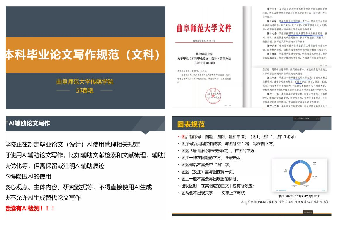 会议聚焦毕业论文的重要性以及写作推进方法展开。邱春艳老师讲到,学生作为毕业论文的第一责任人,需以严谨踏实的科学态度,严格依照撰写要求和相应规范进行写作。在写作指导方面,邱春艳老师进行了系统详细的讲解,涵盖文字排版、图表引用、章节分配、查重率等多个方面。除此,她对AI工具的使用规范进行了说明。她提到,可以合理运用AI工具进行辅助,但是要坚决杜绝“机器代笔”现象,确保学术创作的原创性与思想性。