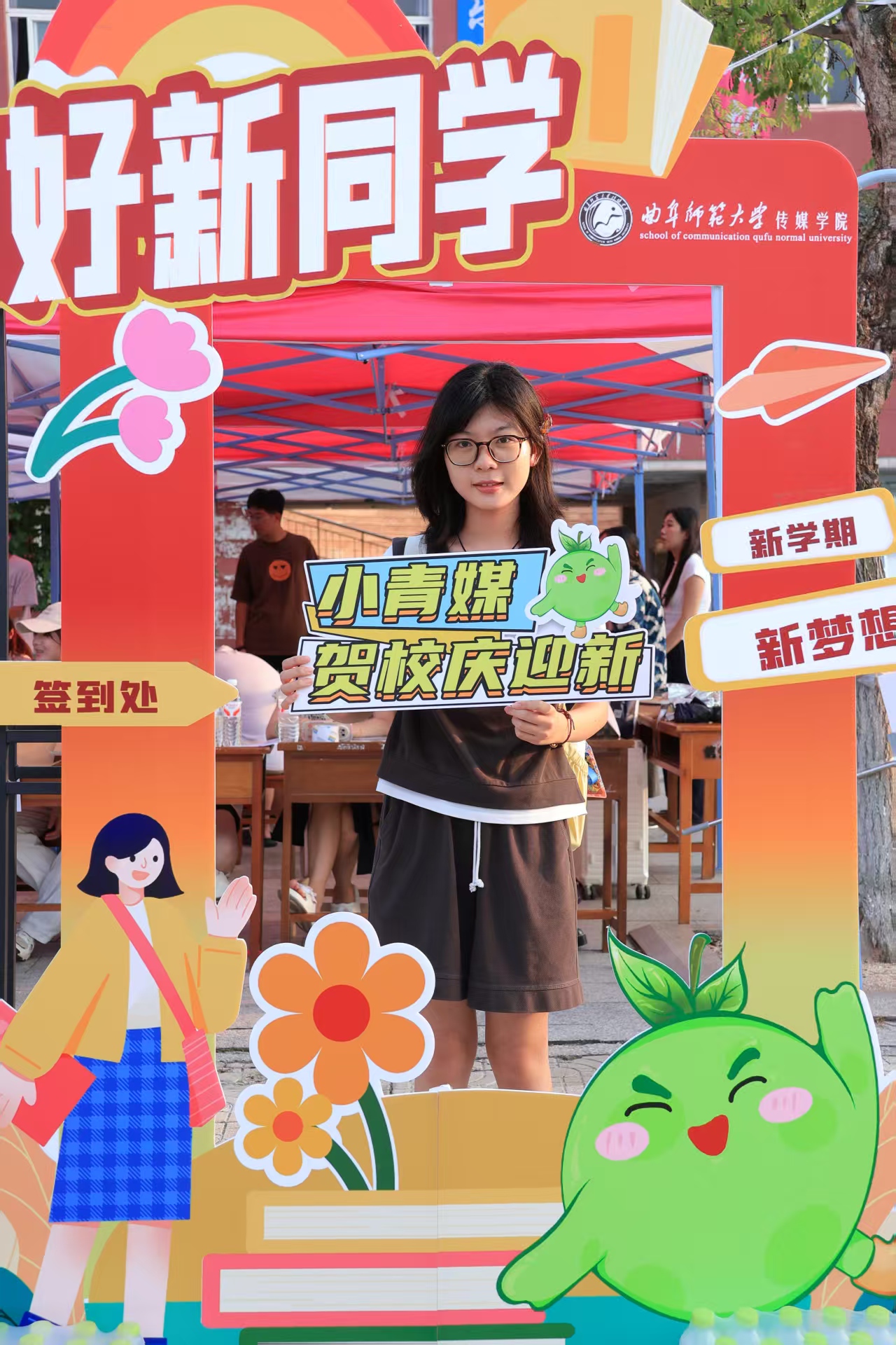 为让新生更快融入传媒大家庭,学院精心设计了多项特色迎新活动和融合专业特色的文创礼物。专属“传媒印象打卡区”以不同的传媒元素和七十周年校庆为背景,搭配可爱的“小青媒”卡通形象,成为新生拍照留念的热门地,快门声中满是新生的笑容。文创礼物则融入了传媒经典符号与校园文化元素,每一份礼物都承载着师哥师姐的祝福,让新生直观感受到学院的用心与温度。