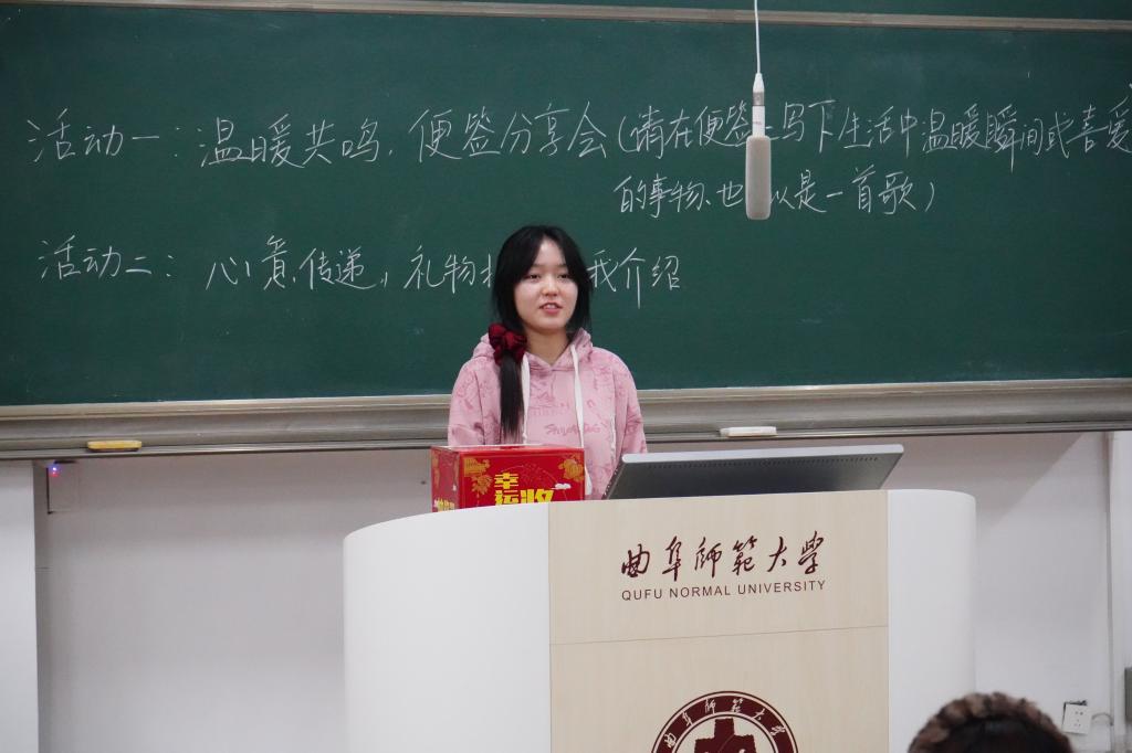 本次活动以“自备礼物+自我介绍+抽签收礼”为主线流程。同学们精心准备了轻量平价且富有心意的礼物,并附上亲笔书写的便签,分享个人小故事或推荐喜爱的音乐,使每一份礼物都成为传递自我、联结他人的情感纽带。在一分钟自我介绍环节中,同学们或幽默风趣,或真诚恳切,充分展现个性,迅速拉近彼此距离。随后的抽签收礼环节更是精彩纷呈,伴随着惊喜与感动,陌生感在温馨互动中悄然消融,现场洋溢着轻松愉悦的氛围。