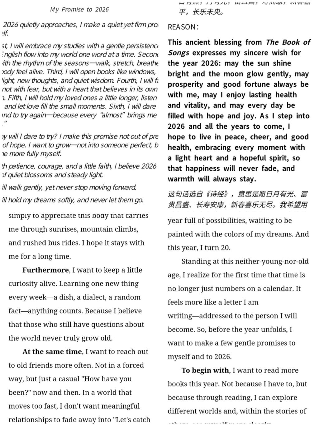 活动以“2026新春愿望”为主题,参与者结合自身经历撰写英文寄语,阐述对未来的期许和思考,提交了一批情感真挚、思想深刻、表达流畅的优秀作品。活动评审从原创性、情感深度和语言准确性三个维度进行综合评定,最终评选出一等奖三名、二等奖五名、三等奖八名。