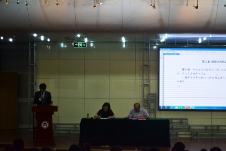 学生考试违规认定与处理办法》(以下简称《办法》)。《办法》所涵盖的范围包括我校组织和承办的各种校内外考试,对我校全体本科生及研究生适用。《办法》从“违规行为的认定”和“违规考生的处理”两方面进行了介绍。违纪行为的九条认定中明文指出,携带与考试内容相关的材料或电子设备参加考试的作弊行为根据情节不同受到责令纠正或警告处分。随后,刘蓉做出几点补充,她再次强调了考生关于考纪、考风方面的规定,要求我院所有学生端正考试风气,严肃考试纪律,并祝愿每位学生都能考出理想成绩。