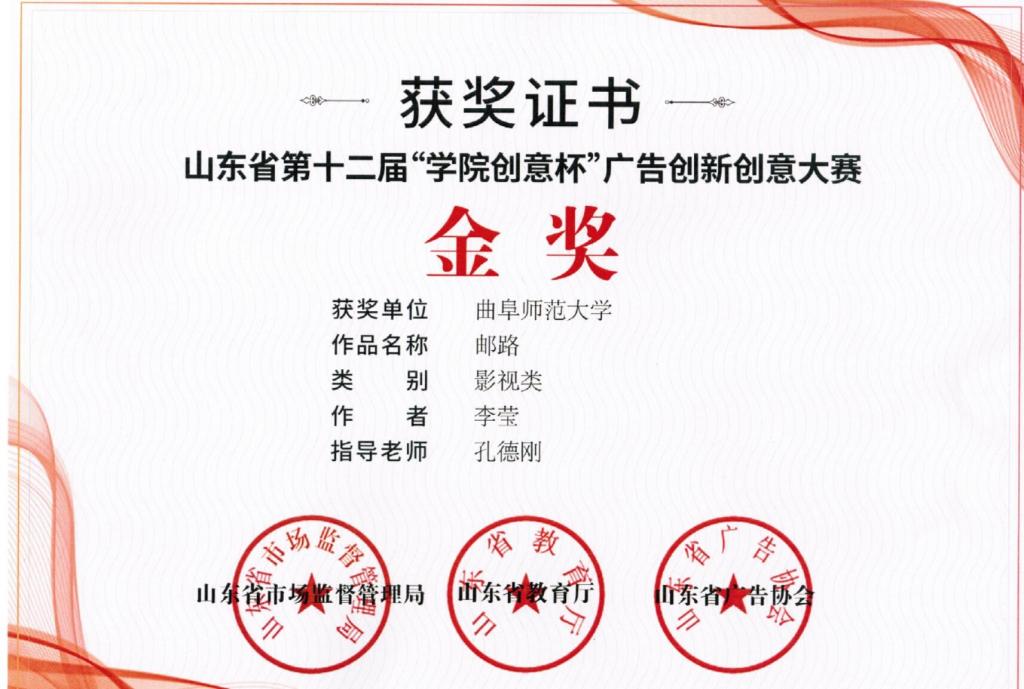 数字媒体艺术专业学生李莹创作,孔德刚老师指导的动画片《邮路》在山东省第十二届“学院创意杯”广告创新创意大赛中,获得影视类金奖。作品讲述了一家三代人在世界海拔最高、里程最长的乡村邮路,克服高寒、缺氧等恶劣环境,坚守岗位,默默奉献的故事。孔德刚老师获得优秀指导教师奖,由其指导的另外两部作品分别获得银奖和铜奖。本次比赛大大提升了学生的参赛水平和积极性,充分展现了传媒学子的实践水平和创新能力。