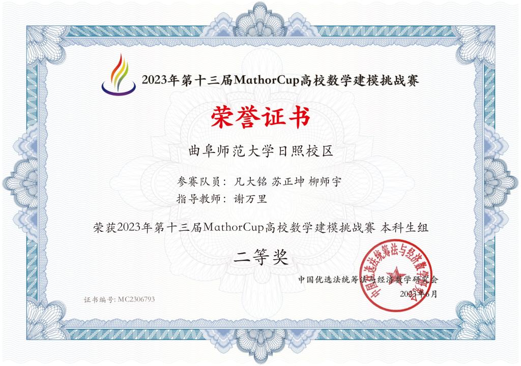 凡大铭、苏正坤、柳师宇三人在学院教师谢万里的指导下,历经四天三夜、共97个小时的奋战,于比赛规定时间内完成竞赛题目并提交论文,从来自738所高校的7494支本科生队伍中光荣胜出,斩获全国二等奖。