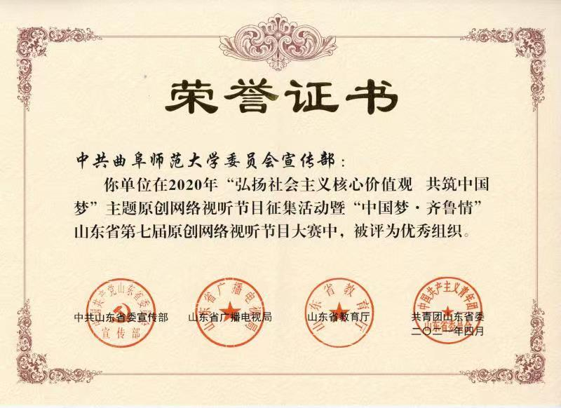 近日,2020年“弘扬社会主义核心价值观共筑中国梦"主题原创网络视听节目征集活动暨“中国梦·齐鲁情”山东省第七届原创网络视听节目大赛落下帷幕。曲师大委员会宣传部获得“优秀组织奖”,我院编辑制作的动画作品《父亲》被评为“优秀网络动画作品”。
