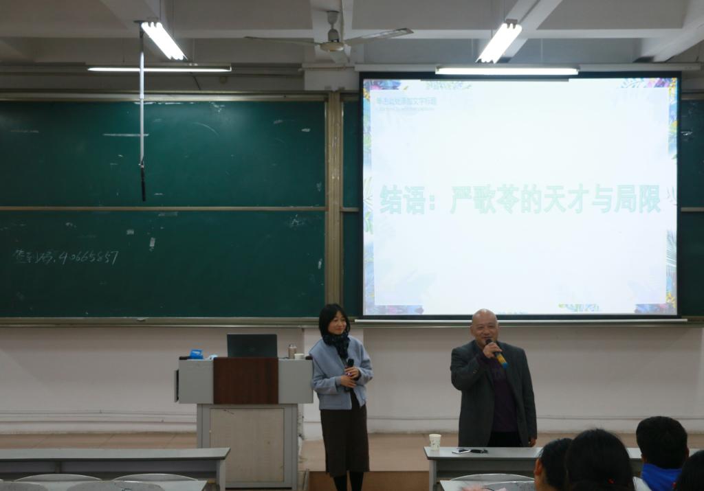 讲座伊始,陈培培以“如何走进严歌苓的世界”为切入点,讲述了自己与严歌苓作品结缘的经历。随后,陈培培带领大家品读了严歌苓的《穗子物语》节选,并简述了穗子的家庭关系。通过严歌苓相关作品的列举,她指出严歌苓之所以能在文学上取得巨大的成就,除了她具有高超的写作技巧外,还能迎合观众与批评家的需求。除此之外,她提出了“严歌苓式套路”这一观点,指出在严歌苓长达三四十年的创作过程中,艺术风貌千姿百态,“谎言”却始终没有从严歌苓的笔端退场。随后,陈培培对严歌苓进行了总评,指出严歌苓的作品更多的是一种循环,没有太多的自我突破,这也正是她天才而又局限的一面。讲座最后,王成一发表了自己的看法,他鼓励同学们要广泛的阅读,自觉接受艺术的感染和熏陶。