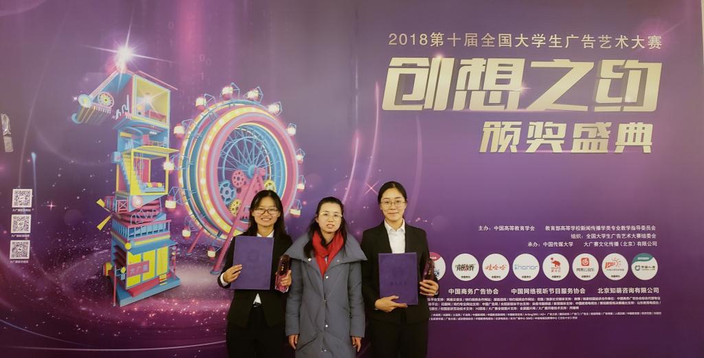 获得区级一等奖1项,二等奖3项,三等奖8项,优秀奖32项,其中6项作品在进入大广赛全国评审的作品中脱颖而出。朱景红和赵敏同学分别以作品《主人,请送我回家》和《杜蕾斯,努力为爱降低存在感》荣获微电影类全国一等奖以及文案类全国一等奖;曲姜冰同学以作品《是谁杀死了》荣获微电影类全国三等奖;刘成新老师获得优秀指导教师的称号。