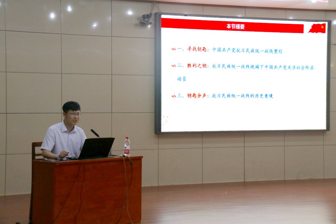 汤锐教授从寻找钥匙、胜利之钥、钥匙余生三个角度具体分析了中国共产党抗日民族统一战线形成的过程及影响。他围绕中国共产党抗日民族统一战线这一主题做了分层阐述,具体讲解了中国共产党抗日民族统一战线的塑形过程,强调了抗日民族统一战线要求下中国共产党关涉社会阶层动员的主要表现,详细讲述了抗日民族统一战线的历史意境。另外,汤锐教授通过列举典型的人物和事件,加深了大家对中国共产党抗日民族统一战线的了解。他还指出了抗日民族统一战线的新特点,强调了以发展的眼光关注抗日民族统一战线的重要性。报告会举行过程中,汤锐教授幽默风趣的讲述方式吸引了大家的注意力。