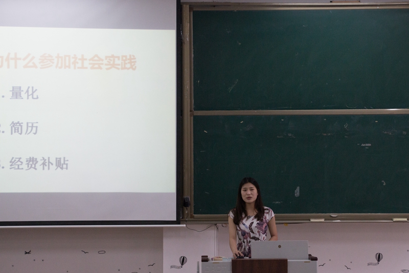 首先,由郑群、李雪琳向大家介绍了社会实践的相关要求及前期应做的准备,并结合往年较优秀的活动主题,重点对2018年暑期社会实践的调研方向及课题选取进行了剖析。随后,结合具体的案例,从选题、申报、实践过程以及报告撰写四个方面对社会实践的开展进行了具体说明。接下来,由往年获奖团队成员张富恒、马强进行宣讲,向大家分享了他们社会实践的体会及收获,并重点介绍了团队在主题选取、实践安排、实践开展过程中的经验,给大家提供了很多宝贵建议,给予初次接触社会实践的同学以借鉴及启示。