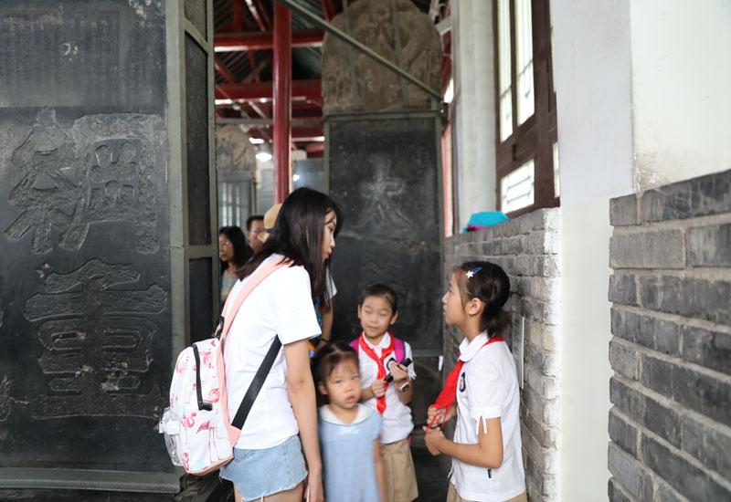 “这一展厅陈列书法名碑,我们看到的《不空和尚碑》是研究唐代中外文化交流的宝贵资料……”稚嫩的童声从展厅里穿来,一群系着红领巾的小学生“坚守岗位”为游客介绍着碑文。这是一群来自西安高新区第六小学的小志愿者,利用假期时间担当博物馆的小解说员,提起名家历史胸有成竹、侃侃而谈的样子令人惊异。他们的带队老师田瑶说:“学生们都是自愿报名,在家中自学博物馆的历史、景点的介绍,再由老师加以指导,便成为碑林博物馆的小解说员。”我们不知道这些历史能在十岁稚童的记忆里存留多久,但这份近距离接触历史、讲解历史甚至是开始用小小的肩膀担起传播历史文化责任的经历也许能在她们心里埋下 “兴趣”的火种,也让国人看到中国传统文化在新一代中传承延续的希望。