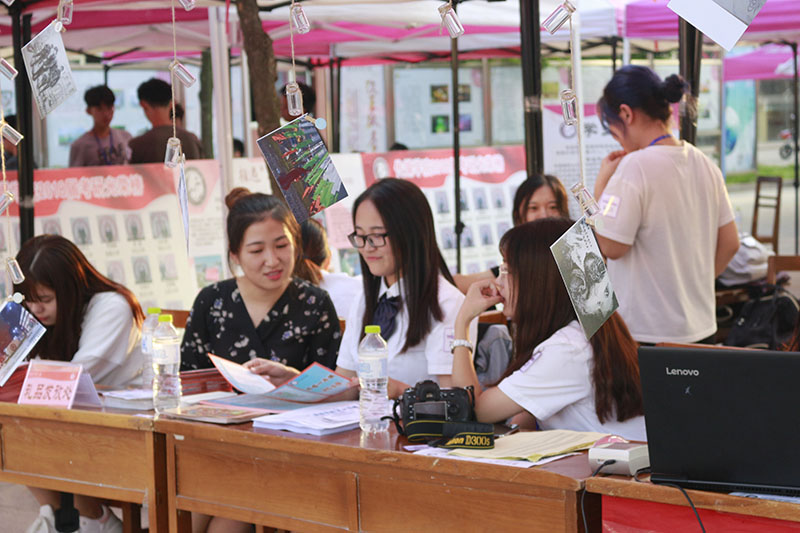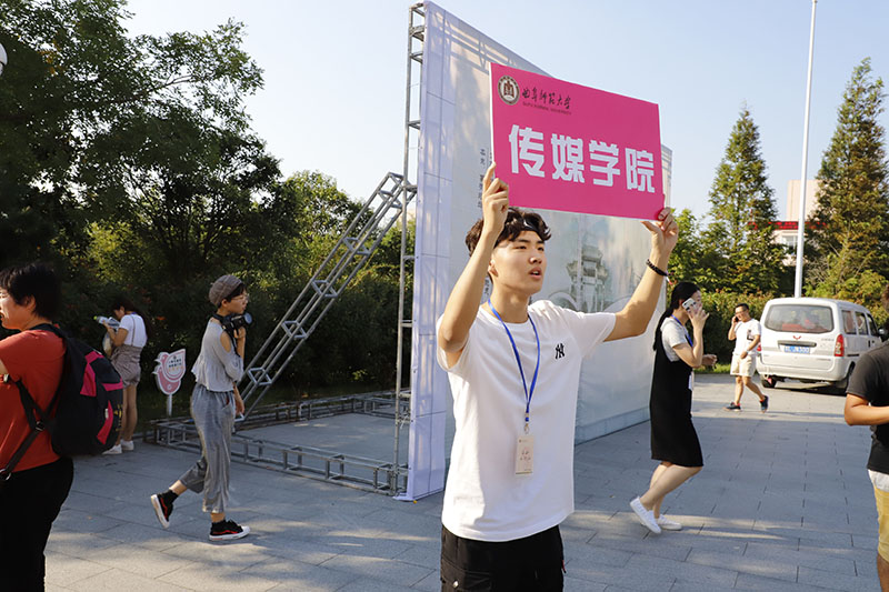 我院礼宾队不畏骄阳,在大本营处引领新生,并且带新生在“传媒一年级”展板处拍照留念。她们身着我院院服,向人们展示了麻豆视频av