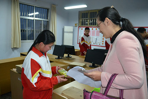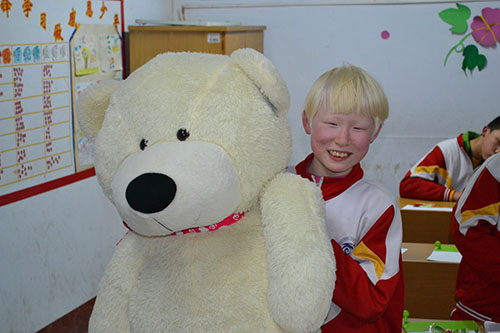 分发的礼物中,有图书,有内存卡,有mp5,有毛绒玩具等等。有一位白化病儿童写下心愿要一个超大的毛绒玩具,同学们为他精心准备了一个1.7米左右高的大白熊。抱着大熊玩偶,孩子满脸灿烂笑容,特殊教育学校的老师开玩笑说这大熊抱回宿舍都放不下。听障二年级的孩子们领到礼物后,不停地打着手语表示感谢,大家还没离开,孩子们便迫不及待地拆开礼物。同学们还参观了特殊儿童的作品展示,一件件精美的作品有序地摆在教室里。感慨难以致信之余,也惊叹特殊儿童们真的是心灵手巧。