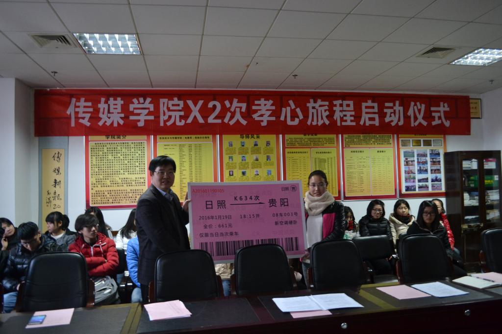 孝心旅程活动的不仅是给家境困难的传媒学子们一张回家过年的车票,更是让他们在此次活动中学会感恩,促进了他们从小事做起,从自身做起,将这份爱心不断的传递下去。受到资助的贵州学生朱艳表示:“一张返程车票,拉近了我与学校学院之间的距离,让我找到了归属感,相信在假期里,这张车票也会时刻提醒我感恩老师的帮助,努力提高自己的能力,争取早日回报社会。”