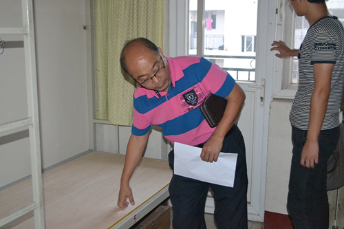 团总支学生会组织安排学生午休期间打扫新生宿舍。肖龙航带领助导对宿舍逐一检查,对于大厅、宿舍和卫生间的卫生严格要求,将宿舍阳台门窗、窗帘损坏情况上报社区。务必使宿舍窗明几净,物品摆放有序,让新生在学院宿舍能体会到家一般的温暖。