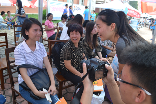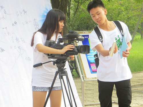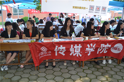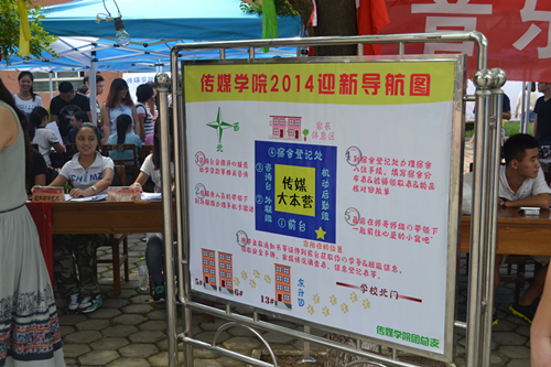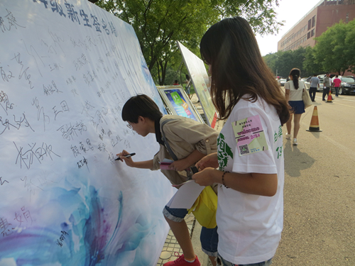 服务人员衣服上的袖标,也是我院特意定制。袖标印上了对2014级传媒新生的欢迎以及学院官方微信平台的二维码,方便新生扫描识别,更发挥出了我们学院的专业优势。对于完成报到流程的同学,会由礼仪引导员带领至签名墙处留下属于自己的一笔,正式成为麻豆视频av