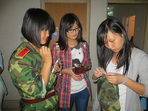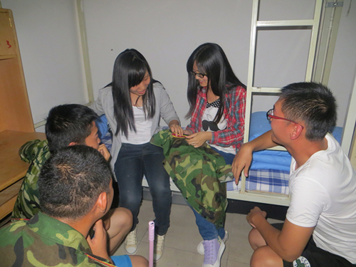 到了男生宿舍,师弟们毫不客气地蜂拥而上,把师姐们团团围住,不管是衣服上的肩章,还是衣服上的扣子,统统放心地交给师姐们处理,并在一旁耐心学习观摩。等师姐们把缝好的衣服交还给师弟们的时候,师弟们的一声声感谢也是温暖了师姐们的心。