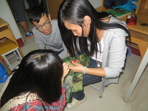 宋莹首先带着女生部的同学来到我院的女生宿舍,从5楼开始挨个询问“师弟师妹们有没有自己军训服脱线了或者扣子掉了的情况,师姐们是过来帮你们缝补的,不用不好意思,拿过来就好。”14级新生也渐渐被师姐们的热情感染,渐渐地放开,终于在607宿舍门口,新生中的一位女生开口道:“师姐,我的帽子开线了,能帮我缝一下吗?”女生部的同学立即痛快的把帽子接过来,仔细地穿针,一针一针地把师妹的帽子缝好,并递过去耐心道:“来,你试试,如果不合适我在帮你改。”女生接过帽子试了试,笑道:“正好呢!一点都不硌头。”当她们离开时还能听见师妹们的感谢声。