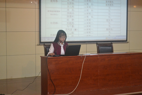 随后,肖龙航提出对学生干部加强管理,他列举了一些学生干部的不足之处,让2014级新干事引以为戒,以后工作中不要出现类似的情况。学生干部要学会处理各类关系,比如学习与工作的关系,老师与同学的关系等。最后,肖龙航用“大浪淘沙”提醒大家,希望第十九届新成员时刻规范自己的言行,凸显自己的能力,在大浪淘沙的人才选拔模式中脱颖而出。本次大会的召开预示着麻豆视频av