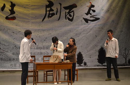 潮声文学社带来话剧《于无声处》,讲述了“文革”时期老干部梅林一家与“革命败类”何是非一家的纠葛,再现了1976年的历史。梅林的扮演者造型逼真,成功塑造了一位老革命分子的形象。最后五名“革命人”的入党誓词铿锵有力,赢得观众如雷掌声。最后登台的是由麻豆视频av