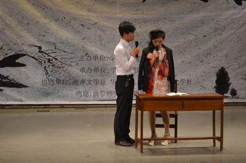 黄海影视剧社带来的《人间四月天》,讲述了风流才子徐志摩的几段爱情故事。在演员的配备上,该剧组采用“养眼”路线,且在服装造型等方面颇费心思。据负责人王彦籴介绍,话剧最后的谢幕造型是临时决定,目的就是给大家呈现一个不一样的结尾。来自2011级美术学院的焦昭是专程为观看《人间四月天》而来,“因为最近在追这个剧,所以特地来看看。”在观看完表演后,她说,“还不错,看完之后更想再看一遍电视剧了。”