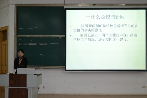 卢长春以新闻标题、导语写作、新闻结构、新闻角度、动态新闻以及如何发现新闻线索等六个方面为大家讲述了校园新闻的写作技巧。她指出新闻标题是吸引读者阅读最重要的因素之一,新闻标题的制作要具体,生动,简洁,鲜明。再就是新闻导语,导语是一篇新闻的概括,需要体现新闻的实质内容,它决定了读者是否会对这条新闻感兴趣,是否会继续阅读下去,导语的成败决定了这条新闻报道的成败。而在新闻结构方面卢长春主要讲述了倒金字塔结构,形象生动的介绍了这种新闻结构的优点和写作方法。对于如何寻找新闻线索,她强调记者要有一双善于观察发现的眼睛,也就是新闻敏感性。在校园动态新闻写作方面,卢长春就会议类新闻,活动类新闻,竞赛类新闻,表彰类新闻四类新闻结合具体案例分别做了讲解。最后对于如何写出角度新颖的新闻,卢长春要求要从读者角度、时间和空间角度等多方面来考虑,不拘泥、不死板,她结合具体新闻案例做出对比与分析,给同学们很大启发。卢长春精心准备的课件和精彩的讲课吸引了同学们的兴趣,赢得了大家阵阵掌声。