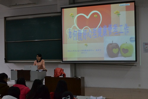 一直是我校潮流的引导者,开展的新闻写作培训班与学生干部培训班等活动历来是开先河的。”陈学宁以“大学是什么”引出主题,系统地为大家讲解了衡量大学生心理健康的标准,大学生常见的心理健康问题及影响因素,了解大学生心理问题的方法和大学生心理问题的预防与应对四个问题。 首先,陈老师指出心理健康具有七个衡量标准,即智力发展正常、情感反应适度、意志品质健全、人格统一完整、自我意识正确、人际关系协调、社会适应良好,并对这七个标准进行了具体细致的阐述,特别指出要了解自己和接纳自己,根据自己的特点确立属于自己的目标,这在考研和干部竞选中也会起到关键作用。随后,陈老师向大家阐述了大学生常见的心理问题,即出现在新生入学的适应方面、学习方面、人际交往、恋爱、求职及个人情绪等方面,并指出大学生易出现的学习障碍。 陈学宁特别指出自卑心理严重是心理不健康的一大重要表现,并以自己亲身经历为例,向大家阐释了自卑的成因是不正当的家庭教养方式和不适当的社会比较。陈老师强调,解决大学生心理问题必须遵循平等性原则、预防为主原则、系统性原则和保密性原则四大原则,并根据自身经验向在座学生干部们介绍了应对大学生常见的心理问题的方法和技巧,当面对有心理问题的同学时,必须掌握谈话的艺术,要有备而来,做到心中有数,多问少说,事前要对谈话内容进行梳理,同时要掌握倾听的艺术与共情的艺术,并向大家特别阐释了共情就是要深入对方内心,理解问题的实质,才能更好地解决问题。 此次讲座使广大学生干部获益匪浅,提高了学生干部们对心理问题的认识,增强了其解决心理问题的责任意识和实际本领。最后,在大家热烈的掌声中,本次讲座圆满结束。