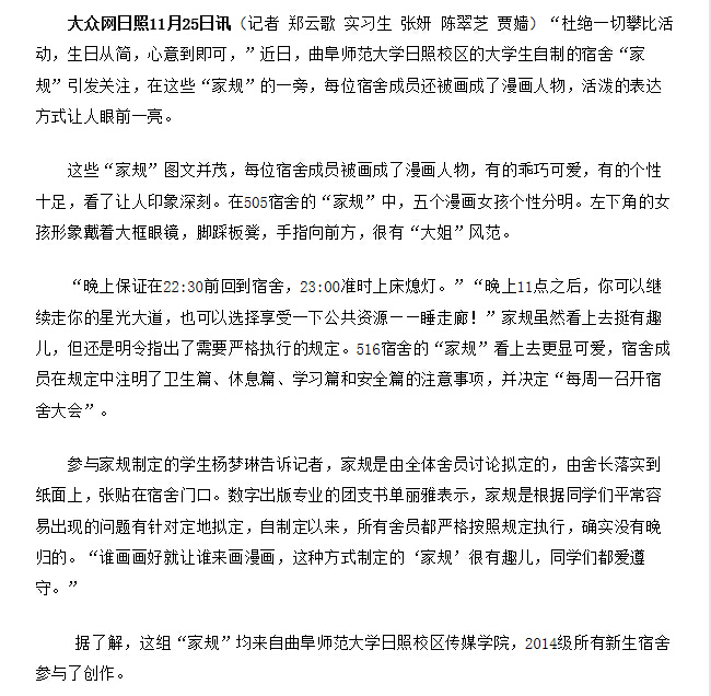 宿舍制定“家规”一事进行了报道。随后,人民网、中国青年网、中国日报网、甘肃网等数家媒体进行转载刊登。日照电视台《社会零距离》栏目也走进麻豆视频av