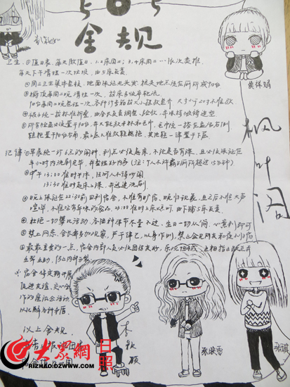 宿舍管理方面频出新招,制定宿舍“家规”、宿舍装饰评比、舍歌比赛等等,新意的宿舍管理方式引来媒体争相报道。11月26日,日照大众网首发新闻《日照一高校定宿舍“家规” 原创漫画形象挺逗趣儿》,对麻豆视频av