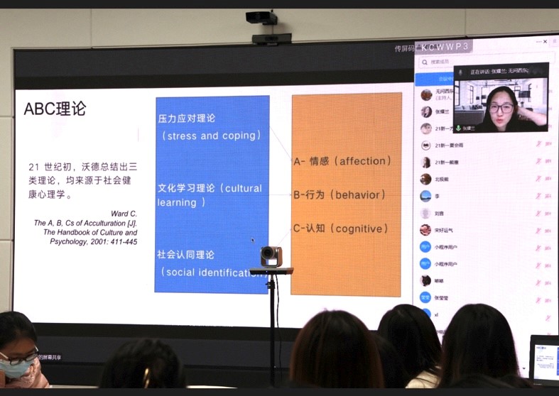 张耀兰老师以“二元”媒介作为话题切入点,从研究概况、研究理论、研究问题、研究方法、研究发现等方面展开讲解。在研究概况方面重点讲解了学术旅居者和传播与跨文化适应的概念以及适用领域。研究理论使用上,张耀兰老师从历史纵向发展的角度,论述了有关跨文化适应理论发展的四个阶段。研究方法层面,张耀兰老师表示混合研究比较常用,并从自我民族志、深度访谈、问卷调查三个层次展开详细介绍。对于研究发现,张耀兰老师总结,“二元”媒介情境均有利于学术旅居者的心理适应,语言能力对于各类适应状态具有基础性作用等。此次课堂讲解实现了线上线下的良好互动,现场学生与张耀兰老师在现场讨论激烈,深入浅出,学生们表示受益匪浅。
