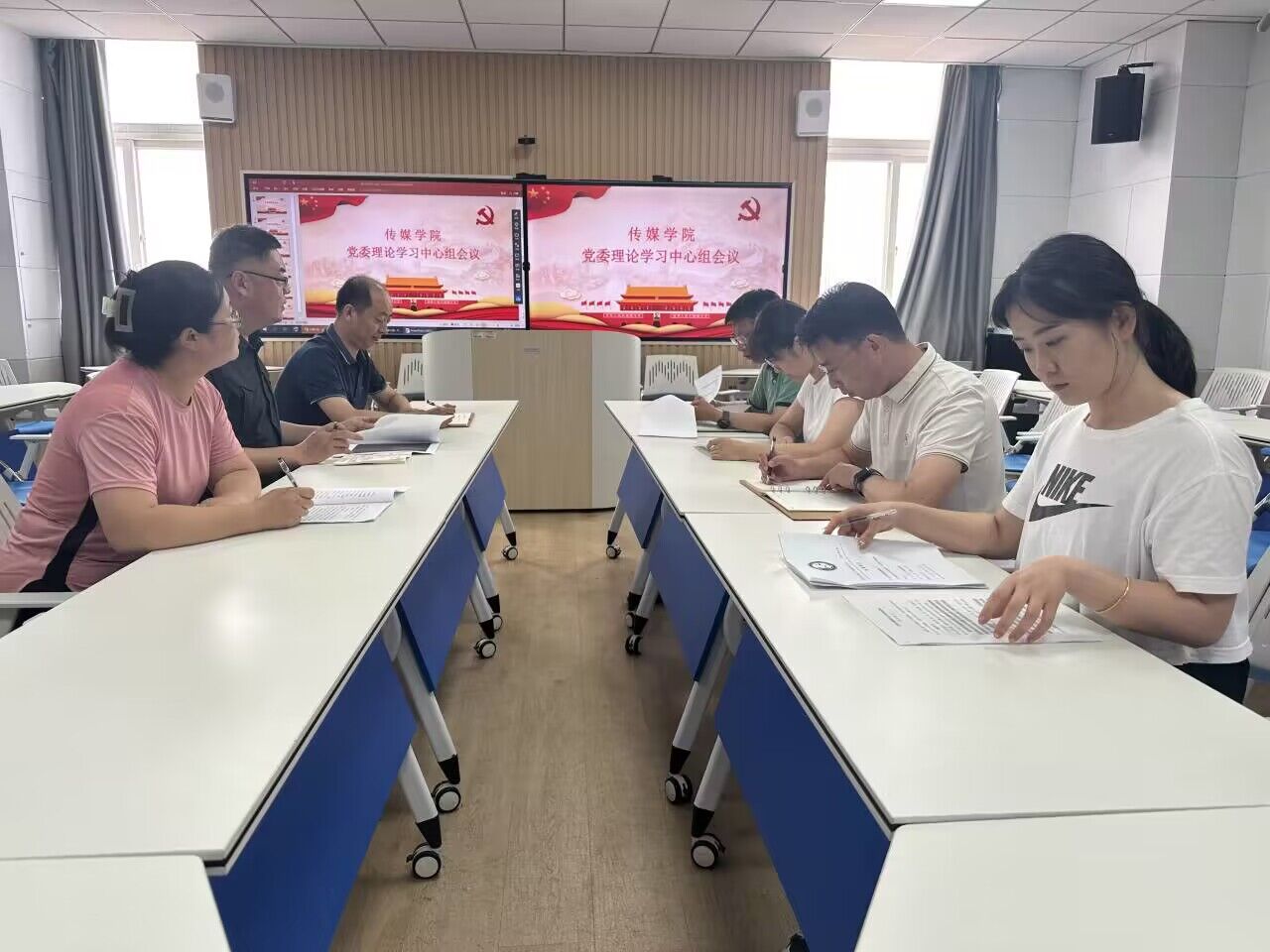 党委理论学习中心组全体成员参与学习并进行讨论。
