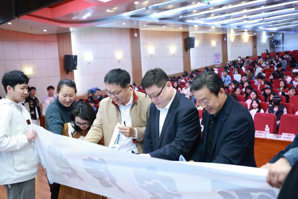 领导老师登台撕下“平安传媒”卷轴上的安全风险事件,共同助力和谐校园建设,并在卷轴空白处签名正式拉开本届麻豆视频av