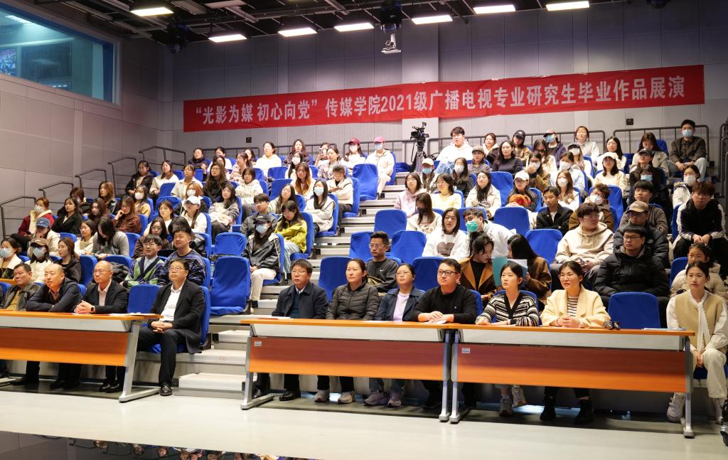 于JS434举办“光影为媒 初心向党”2021级广播电视专业研究生毕业作品展演。传媒学院党委书记田维柱、院长王焕景、党委副书记田荣林、副院长赵可云、团委书记张守荣及学院各党支部书记出席活动,广播电视专业研究生和本科生参加活动。