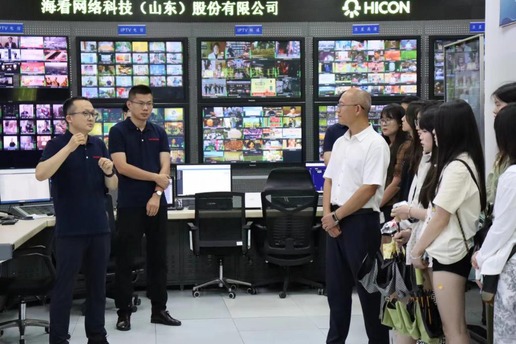 师生参观了山东省广播电视台,深入了解电视、网络和客户端等整合互动传播的全新新闻采编播发的具体流程,感受“一次采访、分类制作、定向推送、多屏分发”模式的魅力所在。工作人员详细讲解了“中央厨房”和集成室的组织架构、运行机制以及新闻大数据,带领学生深入了解新闻作品从选题策划、采访编辑到审核发布的全流程,引导学生直观认识到电视节目的录制、制作和播出的生产全过程,让学生切实感受到数字化和智能化技术在新闻生产、节目制作中的实际应用,真切地理解全媒体时代新闻媒体的转型之路和新闻工作者的新型要求。