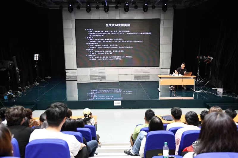 王浩老师围绕“AIGC革命:重塑影视传媒的创意与制作”主题,从生成式AI的定义、AI智能体与Prompts、Al影像创作生态介绍和AI时代下从何做起四个版块为现场师生详细解读了生成式AI的主要类型与实际应用。他以简单的基础模型和大语言模型为例,结合行业动态、自身学习经历以及AI生成视频案例的应用,生动展现了AI功能多样、应用范围广泛的特点。王浩老师全面讲解了生成式AI的驱动原理和大语言模型的基本功能,让师生深入了解了AI的基本原理和场景应用,进一步拓展了师生视野和认知。