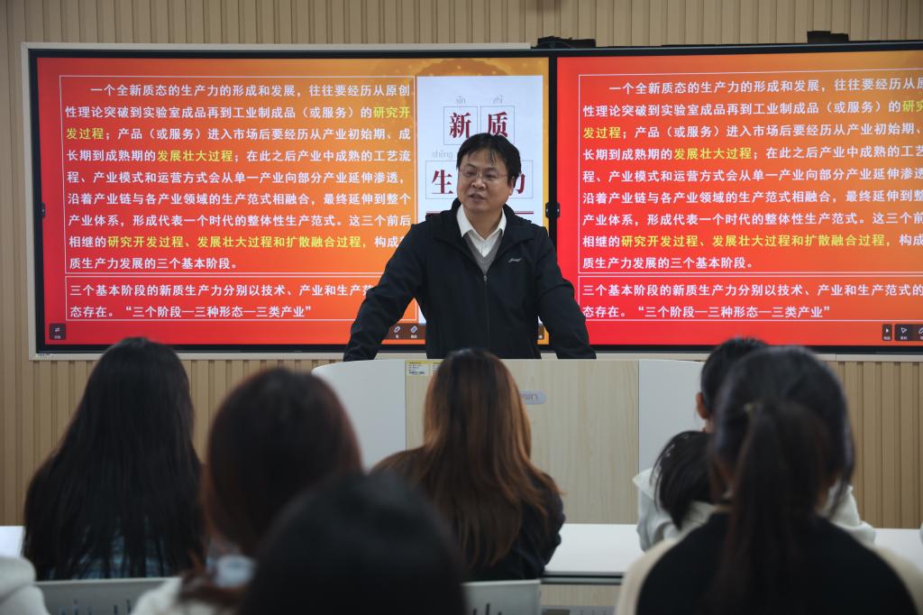 本次课程聚焦于“加快发展新质生产力”这一核心主题,刘刚以精湛的逻辑架构,从“为什么发展新质生产力?什么是新质生产力?如何加快发展新质生产力?”三个维度出发,对“加快发展新质生产力”的议题进行了深入浅出的解读和形象具体的阐述。他首先以党的二十届三中全会对发展新质生产力的战略部署为切入点,借助习近平总书记重要讲话精神和人民网的相关视频资料,详尽阐释了新质生产力的本质含义、显著特性以及关键要素,从而极大地提升了师生们对于“新质生产力”这一概念的认识深度与理解维度。