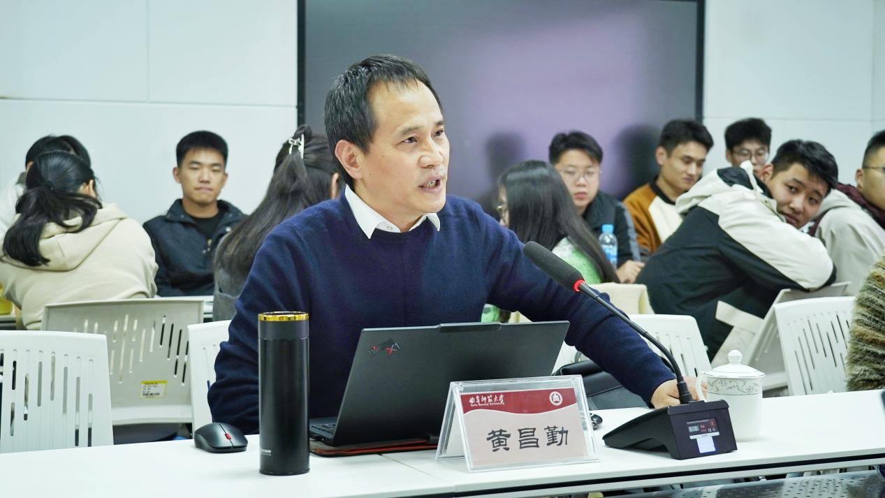 黄昌勤教授以自己的切身经历向师生强调了努力和勤奋的重要性。他围绕AI赋能视角下数字化教育智能转型的研究、实践与发展进行讲解,并着重阐释人工智能赋能教育高质量发展的需求、关键问题、理论创新和方法框架。最后,王焕景院长就此次报告进行总结。