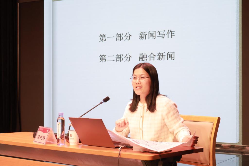 李艳梅从新闻写作与融合新闻两个方面入手,重点探讨了新媒体环境下融合新闻的创作与发布,并为学生提升新闻撰写水平提供了宝贵建议。她从新闻的概念、消息及其写作、其它常见体裁及写作方式、如何进行新闻写作等几个方面,结合新闻传播领域的获奖作品类别,借助曲阜师大报、H5融合媒体新闻等载体,深入浅出地为师生详细讲解了新闻写作的文本特征、报道形式与媒体融合等内容,进一步开阔了师生的新闻视野。随后,她还结合自身丰富的实践经验为学生拍摄新闻图片介绍了具体样例和实践技巧,希望学生们可以通过镜头讲故事,抓住拍摄的合适角度和生动瞬间,用镜头来记录和表达新闻内容。